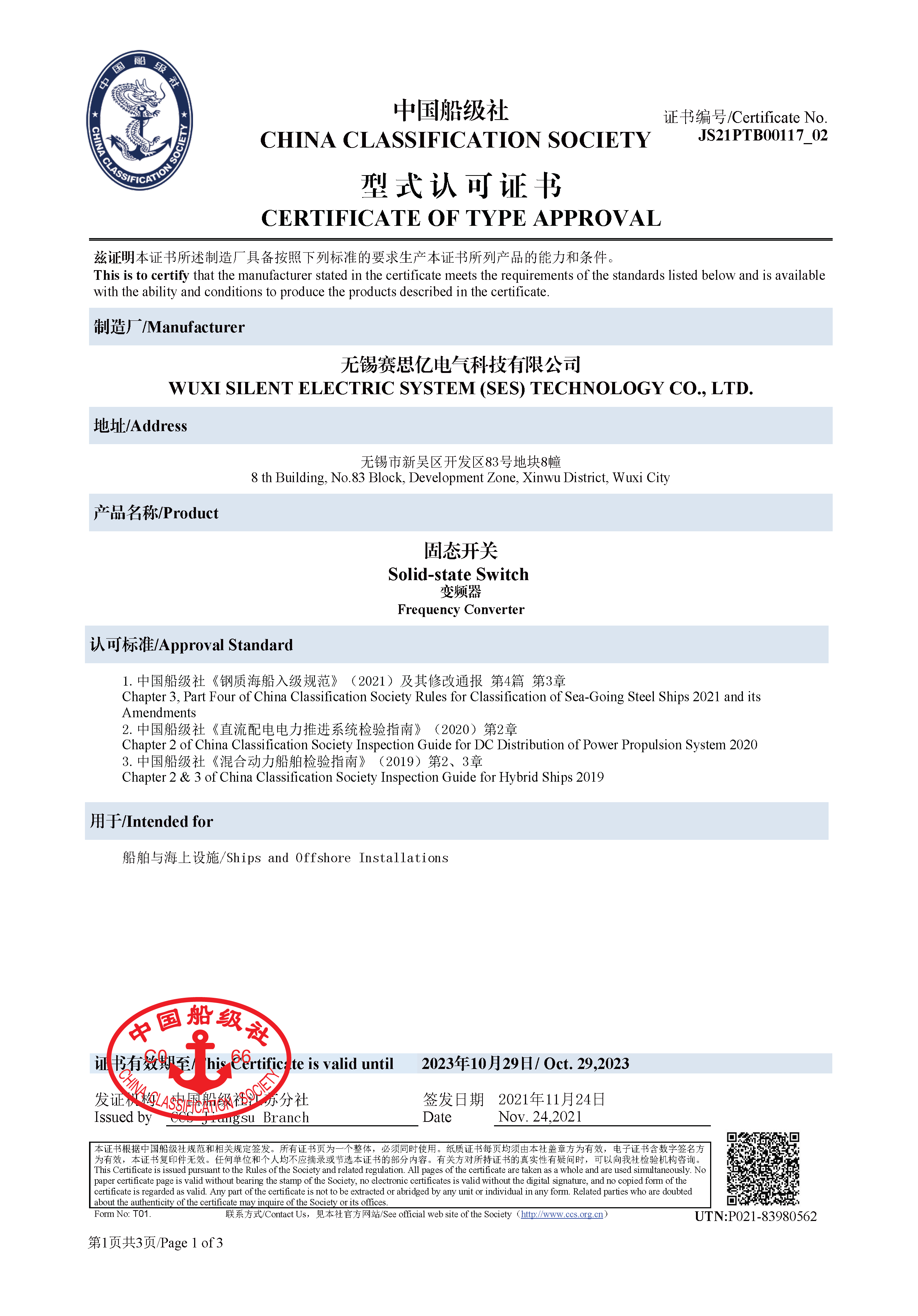 交流半導(dǎo)體控制器歐盟認可組織互認型式認可證書(CCS)