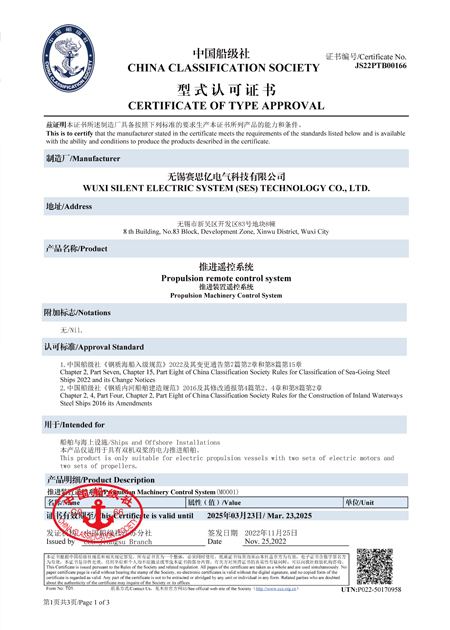 推進(jìn)遙控系統(tǒng)-CCS-型式認(rèn)可證書