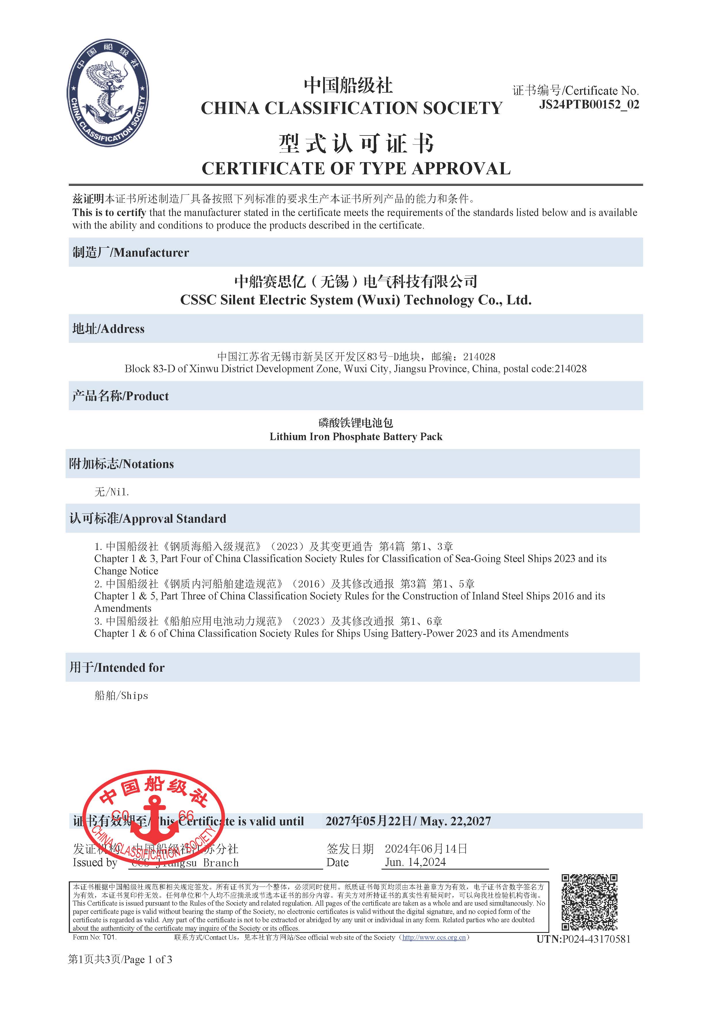 電池包、箱式電源及電池管理系統(tǒng)(BMS)獲中國船級社型式認(rèn)可。
