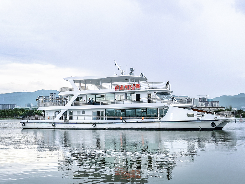 “滇池和諧號(hào)”船長39.8米,型寬10米,雙體船,B級(jí)航區(qū),載客150人,動(dòng)力系統(tǒng)搭載中國船舶無錫賽思億S-Renewable 新能源電力推進(jìn)系統(tǒng),整船配置鋰電池總?cè)萘抗灿?jì)1198kWh,2臺(tái)75kW推進(jìn)電機(jī),用于昆明滇池高原湖泊的觀光游覽服務(wù)。