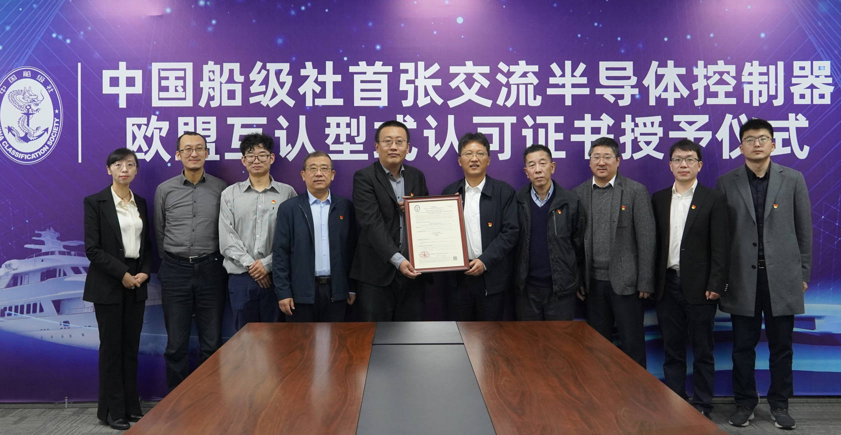 2022年11月17日,中國船級社首張交流半導體控制器歐盟互認型式認可證書授予儀式暨中國船級社江蘇分社與無錫賽思億電氣科技有限公司(以下簡稱“賽思億”)支部共建活動在賽思億舉行,來自中國船級社產(chǎn)品處副處長宮山(線上參會)、中國船級社江蘇分社副總經(jīng)理杭仲九、產(chǎn)品處處長陳翔、副處長陳旭等一行領導出席授予儀式。中國船級社江蘇分社副總經(jīng)理杭仲九代表中國船級社產(chǎn)品處副處長宮山將首張交流半導體控制器歐盟互認型式認可證書授予賽思億總經(jīng)理烏云翔博士。借此契機,雙方深入交流合作開展支部共建,深刻學習了黨的二十大報告要點,深化黨建和業(yè)務融合,并進行了廣泛的技術(shù)交流。