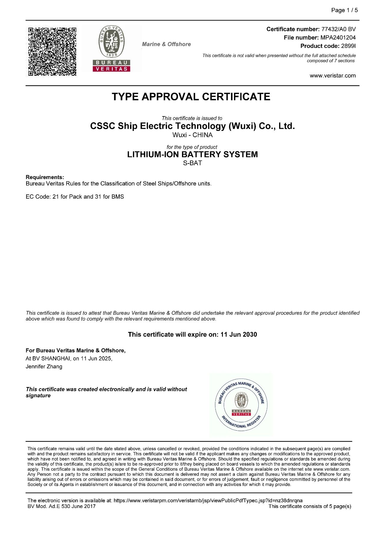 2025年6月11日,中船賽思億(無錫)電氣科技有限公司(CSSC Ship Electric Technology ( Wuxi) Co.,Ltd.)磷酸鐵鋰電池系統(tǒng)順利取得法國船級社 (BV) 型式認可證書,是中船賽思億進軍國際船舶建造項目的一塊強有力的“敲門磚”。截至目前,中船賽思億憑借強大的技術攻堅能力,已實現(xiàn)自產(chǎn)電池包(模組兼容寧德時代、億緯鋰能等品牌)及BMS電池管理系統(tǒng)全系列產(chǎn)品的全覆蓋,且均已順利取得中國船級社(CCS)、法國船級社(BV)兩大主流船級社型式認可證書,對中船賽思億深耕海內(nèi)外綠色船舶市場開拓具有重要意義。