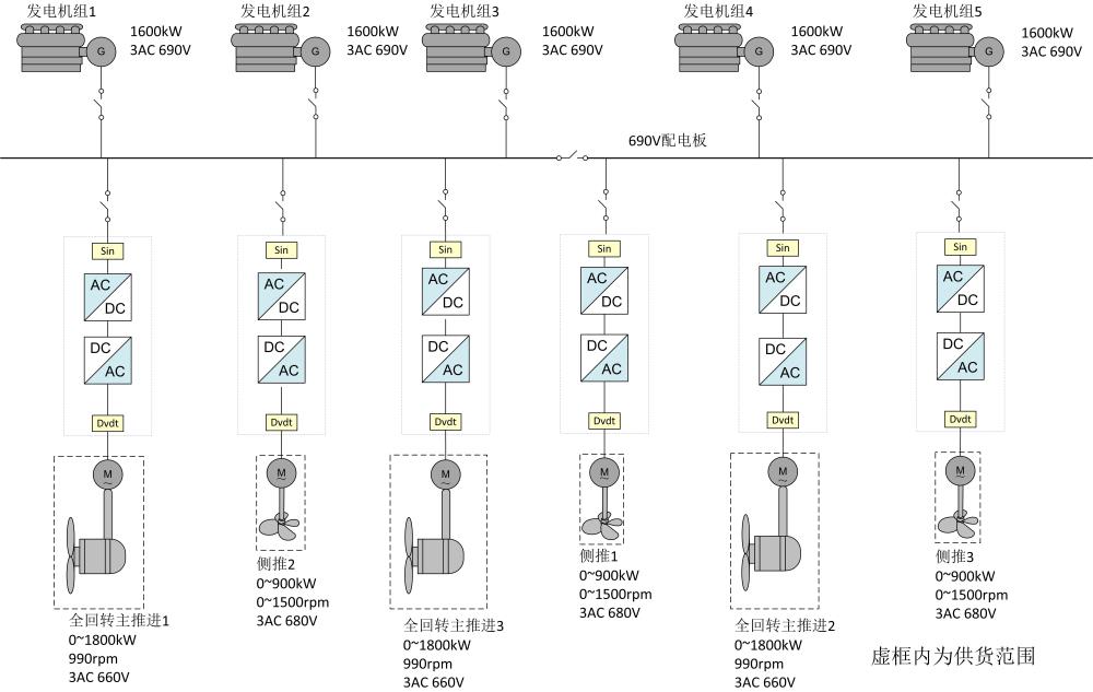 賽思億為1200T海上風(fēng)電安裝船提供的電力推進系統(tǒng)主要包括:3臺艏側(cè)推變頻器、3臺艉推進變頻器、3臺艏側(cè)推電機和3臺艉側(cè)推電機、舵槳和遙控等。 賽思億核心變頻器具有CCS、RINA、BV三大船級社型式認證,已廣泛應(yīng)用于直流組網(wǎng)電力推進、交流組網(wǎng)電力推進、軸帶混合動力和岸電變頻電源等場景中,該風(fēng)電施工平臺是國產(chǎn)變頻在海上風(fēng)電領(lǐng)域的再次應(yīng)用。