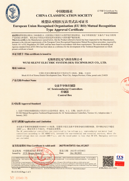 交流半導(dǎo)體控制器歐盟認可組織互認型式認可證書(CCS)